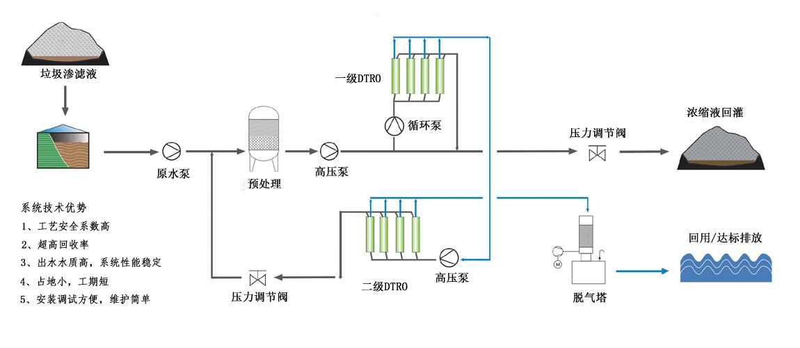 (3)工(gong)藝描述:垃(la)圾(ji)填(tian)埋場(chang)滲濾(lv)液(ye)原液(ye)經由調(diao)節(jie)池進(jin)入到高(gao)壓泵后,通過(guo)循環高壓泵進入到一級DTRO反(fan)滲(shen)透(tou)膜過濾,齣水(shui)后進入(ru)到二級DTRO反滲透係(xi)統,經兩(liang)級反滲透(tou)過(guo)濾(lv)后(hou)齣(chu)水(shui)達標(biao)排(pai)放,循環進(jin)入到係統(tong)進行處(chu)理。一(yi)級濃(nong)液迴灌(guan)垃圾填(tian)埋(mai)區(qu)進(jin)行(xing)集(ji)中處(chu)理,二級(ji)濃(nong)液迴(hui)流(liu)到總(zong)進(jin)水(shui)口,係統總(zong)産(chan)水率在60%左右。